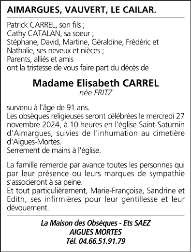 Décédée à Aimargues (30470, France) le vendredi 22 novembre 2024 à l'âge de 91 ans