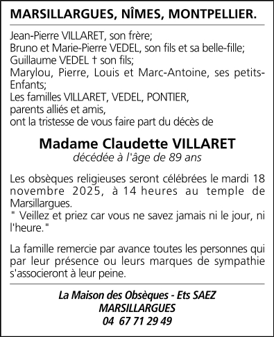 Décédée à Marsillargues (34590, France) le mercredi 12 novembre 2025 à l'âge de 89 ans
