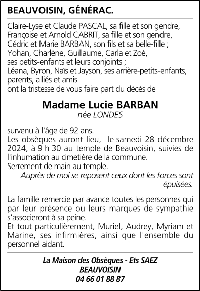 Décédée à Beauvoisin (30640, France) le mardi 24 décembre 2024 à l'âge de 92 ans
